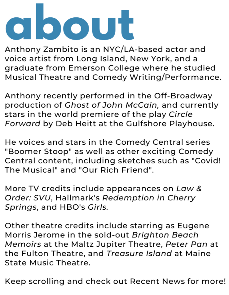 “Anthony Zambito gives an award winning portrait of 15 year old Eugene Jerome...Zambito’s enthusiasm on stage is infectious, frequently breaking the fourth wall, but with a naturalness that makes you know this person and feel he is talking to you as a friend but from another era.”